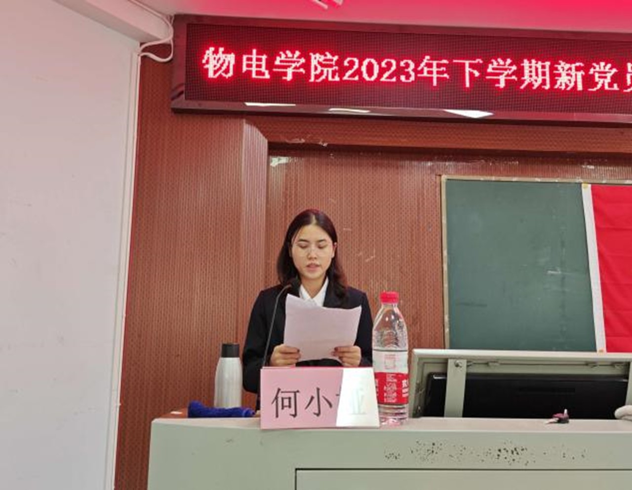 宣誓结束后,新党员代表徐丽娜发言,表示党员是一种荣耀,更是一种责任,要把入党誓词作为自己终身的追求,听党话跟党走,不负党的殷切期望。最后她呼吁全体党员团结一心,共同努力,为实现党的使命而不懈奋斗。