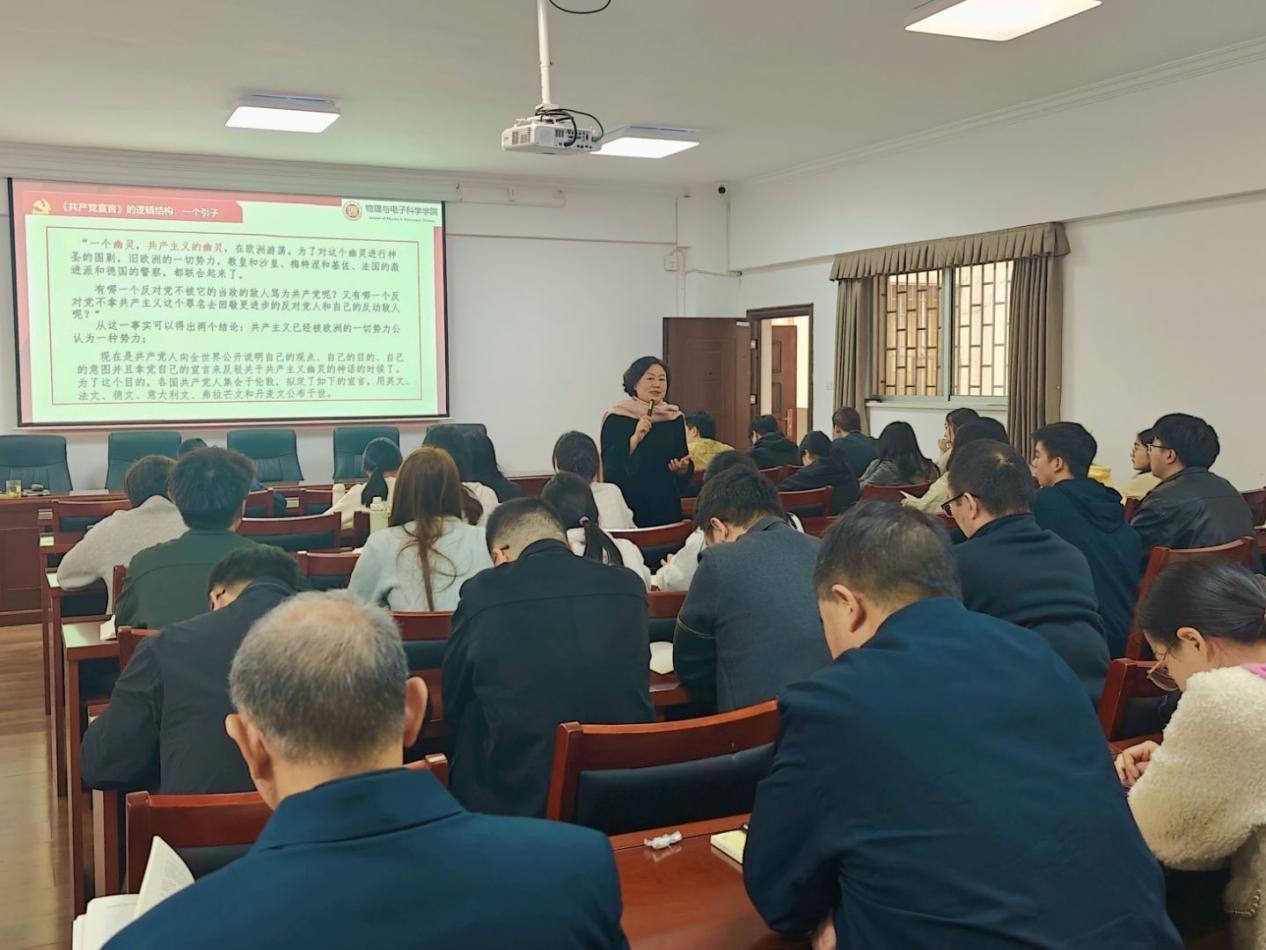周畅首先阐述了《共产党宣言》作为马克思主义诞生的标志性文献是党员和入党积极分子必须学习的经典原理原著,是我们掌握马克思主义的立场观点方法最重要的学习内容。然后从马克思、恩格斯的生平事迹展开,结合《共产党宣言》的写作背景,分步骤剖析了这部经典著作的形成过程与内在逻辑结构。在党课讲解中,她提到,《共产党宣言》对国际共产主义运动发展、中国特色社会主义事业推进均具有深远影响。习近平总书记曾多次强调学原著悟原理的重要性,指出唯有学深、弄懂、悟透原著内容,才能为理解党的理论奠定坚实基础。