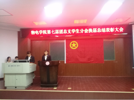 大会共分为十二项议程,在嘹亮的国歌声中,总结表彰大会正式开始。首先由张恒道老师致辞。议程第三项是团学各部门进行了任期内的工作汇报,各部门用一张张照片,一份份表格,一个个数据清楚的展示自己在一年里所做的工作。议程第四项是第七届团学分会主席林琪琅和员工副书记刘妍做团学工作总结报告。议程第五项团总支书记张恒道老师宣读了表彰文件并对优秀干部干事进行了颁奖。议程第七项宣布第八届团学委员名单。议程第八项第八届员工会主席李泽鹏,员工副书记黄欢进行了就职发言,议程第九项两届主席团交接院旗。议程第十项第八届团学委员会委员进行了集体入职宣誓。
