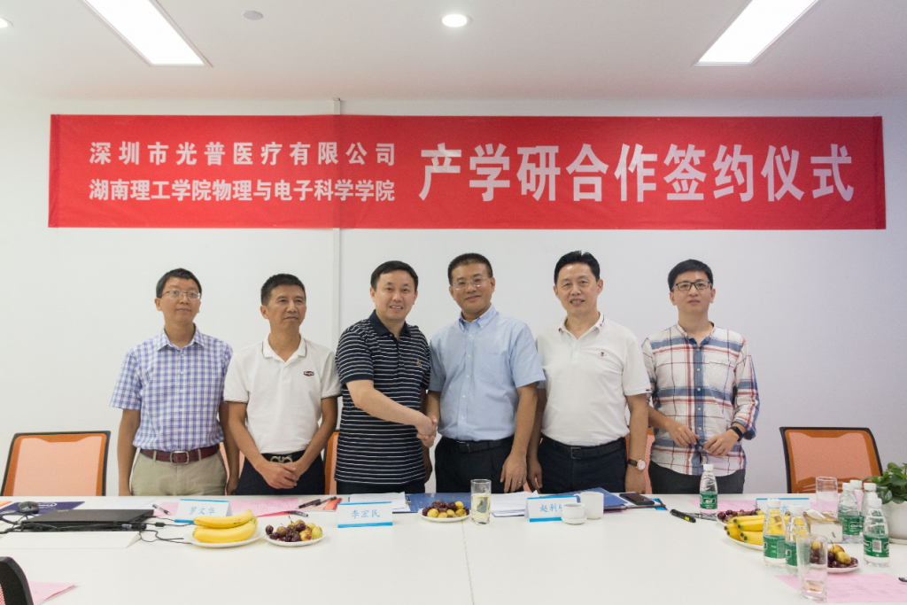 8 月 5 日,英国上市公司官网365(以下简称英国上市公司官网365)李宏民经理、罗文华书记、田芃博士一行到深圳市光普医疗有限公司(以下简称光普医疗)进行实地考察。现场,双方签订了产学研合作协议,并举行了产学研基地挂牌仪式。