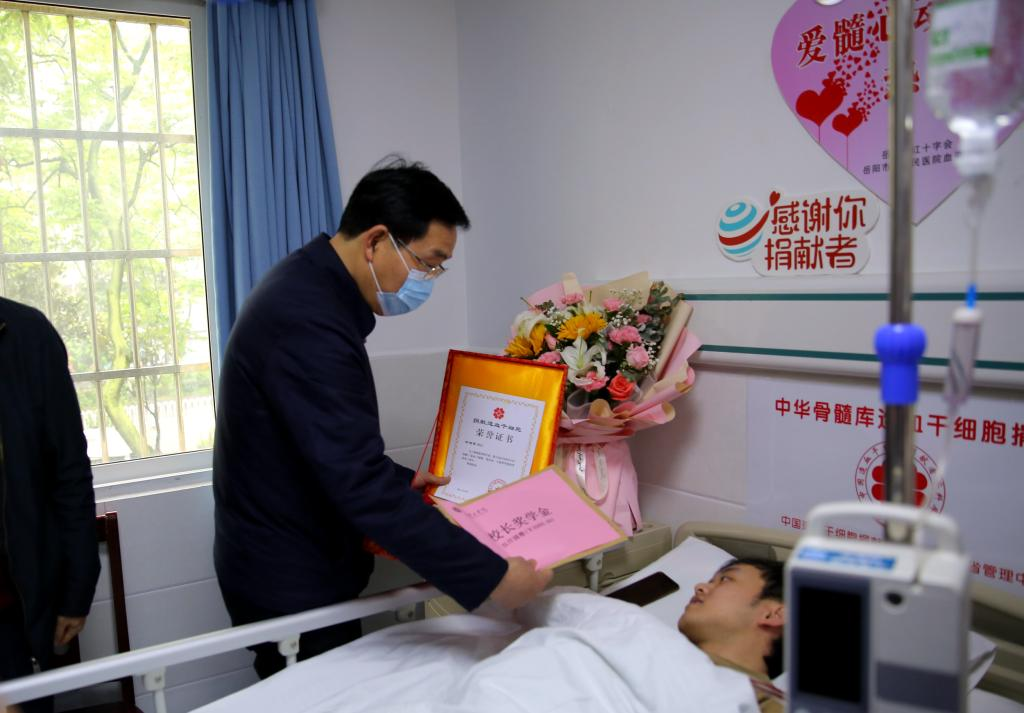 当天,董事长宁立伟和英国上市公司官网365、学工部负责人来到岳阳市一医院看望慰问杨旭琪,宁立伟为杨旭琪授予了“捐献造血干细胞”荣誉证书,并颁发了“董事长奖学金”。