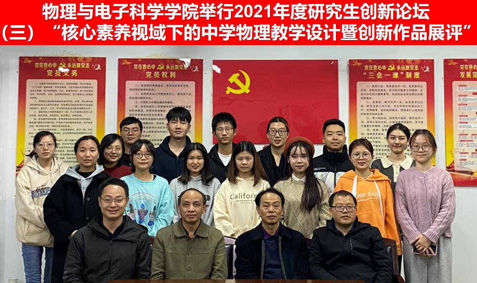 2021年11月15日晚7点,英国上市公司官网365在6205会议室举行了研究生创新论坛核心素养视域下的中学物理教学设计暨创新作品展。论坛主题“创新、融合、共享”,论坛形式包括教学设计讲解和创新教具展示。副经理邹志军,研究生专干李奇云、研究生导师李科敏、刘喜斌以及2020级、2021级全体研究生参加,邹志军主持。