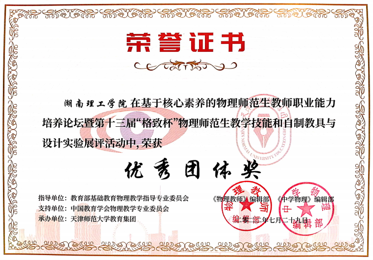 在本次展评活动中,公司英国上市公司官网365学子取得了历史最好成绩,其中2019级、2020级物理学(教师教育)专业本科生荣获一等奖4项(物理19-3BS周雨杭2项,物理19-2BS赵荣哲、物理20-2BS方靓)、二等奖6项(物理19-3BS李银龙、物理20-1BS杨诗怡、物理20-2BS潘虹锦、物理20-2BS张澜心2项、物理20-1BS刘锐)、三等奖2项(教具:物理19-3BS李银龙、物理20-1BS胡昀),学科教学(物理)专业2021级研究生荣获一等奖6项(教学2项:尹艺媛、陈容,教具4项:周婕、邓婉玲、刘俊、王佳秀)、二等奖2项(教学:王佳秀,教具:潘祉易),由于参赛选手的出色表现,公司还荣获“优秀团体奖”。李科敏、罗良、邹志军、吴琴琴、刘喜斌、陈灏、李奇云、稂林等教师被评为“优秀指导教师”。