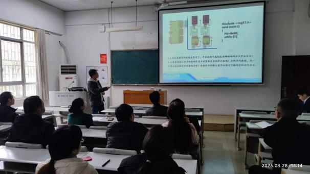 孙小香博士针对《微电子器件基础》课程进行了10分钟的说课和5分钟的教学片段展示。说课围绕课程概述、学情分析、思政融入和建设成效四个方面展开,从整体上概括了《微电子器件基础》课程的课程地位、对专业人才培养的贡献以及思政改革对课程成效的提升。教学片段展示对第五章第二节MOS场效应晶体管工作原理进行讲解,以前沿科技状况为切入点,采取信息化手段、分组讨论和动画展示等方式,融入我国“神威”计算机研制成功、“芯战”带来的科技差距等思政元素,调动员工学习热情,激发员工学好该课程的责任感使命感。禹卓良博士以《单片微机原理》第11章第1节的“LED数码管静态显示”为例,介绍了LED数码管的结构和显示原理,比较了硬件译码和软件译码的区别。在课程讲授的过程中融入了 “资源节约”、“十四五规划”以及“学习雷锋精神”等思政内容。