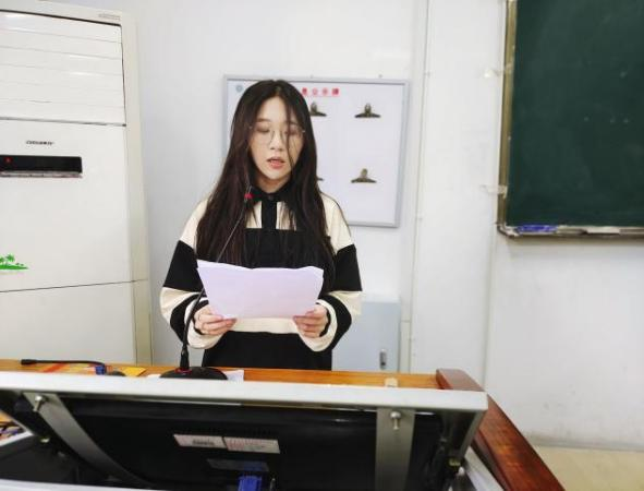 之后,彭紫涵作为入党积极分子代表发言。她说作为一名优秀的入党积极分子,首先应当认真学习党的指导思想,将其视为自己的行动指南;其次要保持蓬勃向上、意气风发的精神面貌,以先进模范为榜样,用心学习、用心工作;最后,入党积极分子要时刻关注党的动向,关注时事热点,紧紧团结在党的周围。同时,她也代表全体入党积极分子表态:将严格遵守学习纪律,认真参加学习、讨论和实践活动,认真学习党史、党章和党的理论知识,圆满完成学习任务。