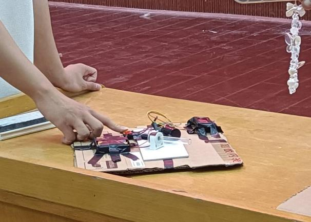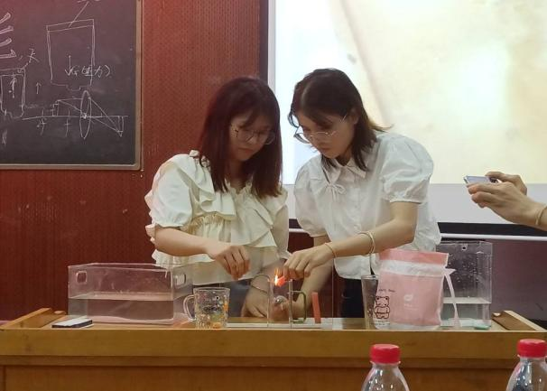 决赛共有9个团队,均为前期工作选拔出来的优秀选手,比赛要求参赛者进行实验展示、现场投屏和实验解说。实验展示中,他们严谨细致、合作默契、实验效果明显、成功率高,展示了良好的团队合作精神;现场投屏环节,各组利用现代教育技术将实验过程同步放大到屏幕的创新做法,让全场观赛者十分清楚观察到实验细节;实验解说环节,他们科学有序、条理清晰、重点突出、简洁易懂,可以从有趣的实验现象中很好地把握其中的物理规律。参赛者选取纸张、蜡烛、玻璃、食用油、水等生活日用品作为比赛实验器材,展示神奇的物理现象,深深感染了在场观众,同学们沉浸在科学探究之中。