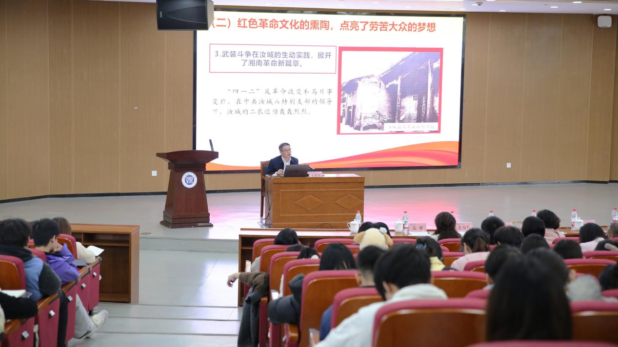 汝城县委党校常务副董事长黄成林结合汝城红色历史,对“半条被子”精神作了深入解读。他指出,故事集中展现了“革命必胜的信念、严明的纪律作风和深厚的军民团结”,是共产党人初心使命的鲜活体现。他强调,“这半条被子不仅是军民情深的见证,更是激励我们走好新时代长征路的宝贵精神财富”,并鼓励物电学子从红色历史中汲取前行力量。