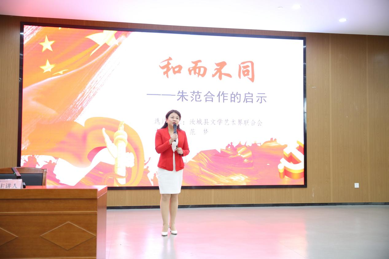 之后,宣讲团成员范梦以《和而不同——“朱范合作”的启示》为题,通过历史案例阐释团结协作的重要意义,引导师生理解“志同道合凝心聚力,互信包容共谋发展”的共产党人大智慧。