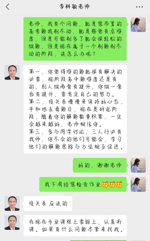 老师也常说作为研究生需要眼光长远点,我们要为自己以后做一名优秀的教师而努力。第一,多刷高考题;第二,多备课后试讲。我也会学着科敏老师做一个幸福的人。