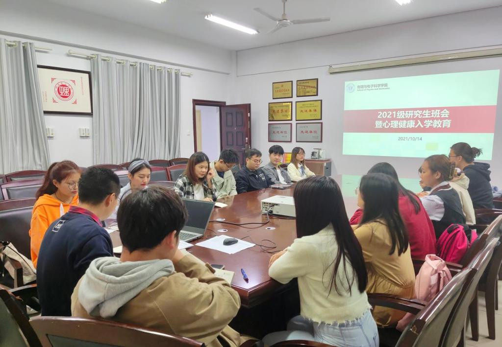 2021年10月14日晚7:00,英国上市公司官网365在6栋6205会议室召开了2021级研究生班会暨心理健康入学教育。副经理兼班主任邹志军,辅导员张庆喆以及全体2021级研究生参加,邹志军主持。