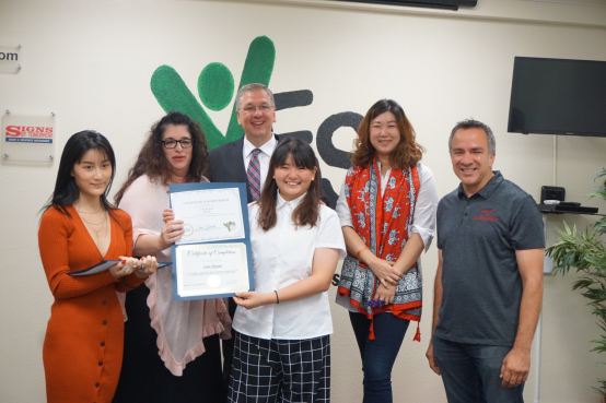 (在UCLA的大礼堂进行毕业典礼,国际交流公司的经理授予证书)